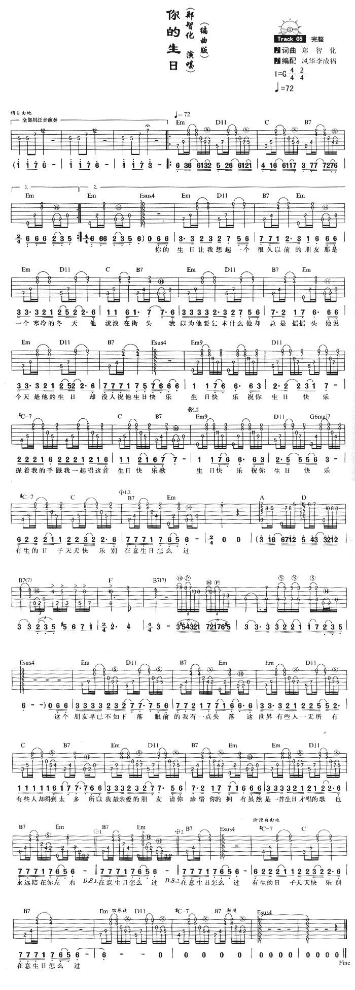 《你的生日》吉他谱,由郑智化演唱的,流行弹唱编曲版,你的生日六线谱,C调制法,一共1张高清弹唱图片谱,采用'4/4拍子,拍速为60-80,单吉他,弹奏难度为:简单,由李成福编配分享,吉他bbs网整理上传。
