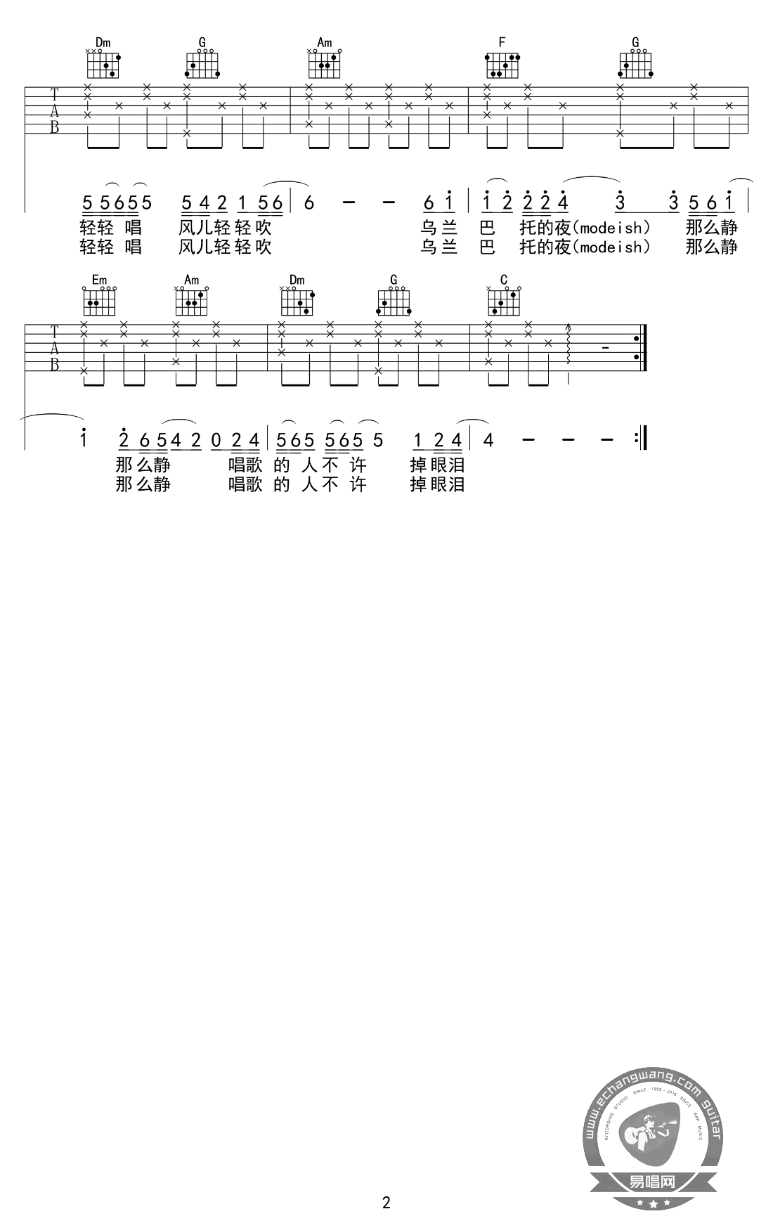 乌兰巴托的夜吉他谱,原调D,变调夹夹二品,乌兰巴托的夜六线谱,两张高清图片谱。靠谱吉他出品,王进版本。喜欢民谣,因为它像诗一样,唱出一种情怀,平静湮灭在庸碌里的内心,这首乌兰巴托的夜 好听!
