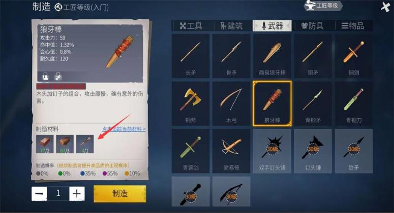 这款游戏的主要玩法就是依靠生存能力来获取更多的资源。游戏需要玩家不断打造适合自己的武器来狩猎和收集物资。最常见的自卫武器是狼牙棒。