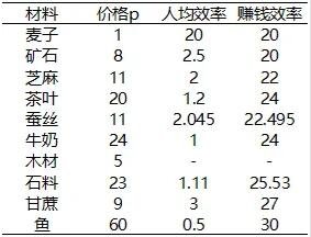 例如,在没有工具加成的情况下,一块麦田的单线产量为20/分钟,小麦的价格为1,居民占用1,没有成本。小麦赚钱效率为=20*1/1=20。这个效率可以分解为人均效率=单位时间的生产数量/居民占有率=20/1和产品价格1。