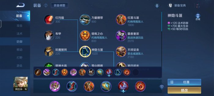 对方多控阵容的第四件,辅以阻力鞋。魔抗装备的网格是灵活的。当你有扁鹊、蔡文姬、桑奇等时,可以选择凤凰之眼,可以提高队友对抗阿古朵和自己技能的回血。技能的血量恢复;抑制爆发的英雄选择黑夜的守护者;反消耗、太阳之类选择女巫斗篷(对方射手加洛不要选),多法师阵容的魔抗装备提前做好,鞋子后期正常更换。复活甲、名剑等保命装备(如果是常规生产装备,后期鞋子也可以用姬影替换),后期经济高。血魔之怒升级愤怒之魂。