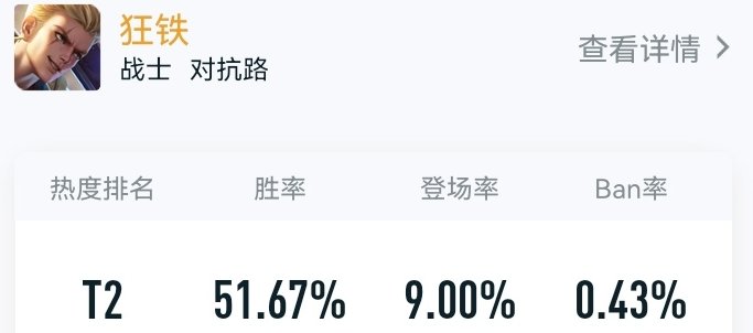 匡铁这个英雄虽然只排在第二梯队,但是他的实力却不容小觑。根据elo机制,王者荣耀官方会尽可能将每个英雄的胜率保持在50%左右。他们将有不同的胜率。以元歌为例,一个可以达到t2门槛的t3英雄。他的胜率是49.23%(制作时的最新数据,数据可以在王者阵营中查看)