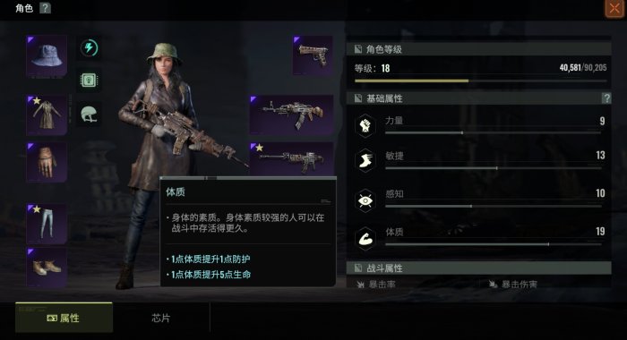 体力:更大的力量可以大幅度提高对重武器的控制,提高重武器;敏捷性:灵活移动的能力;感知:视觉、听觉、味觉以及发现异常情况的能力;体质:体质越强的人,在战斗中生存的时间就越长。