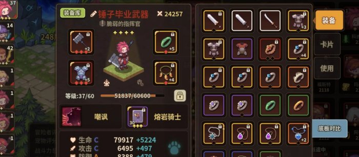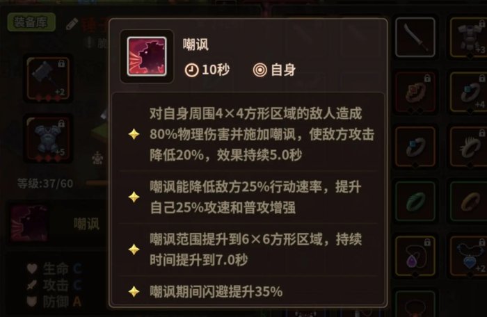 然后就是四星无敌前排嘲讽,无论是嘲讽还是盾战,都可以带熔岩骑士,金手指刀真爽,而且还有很多buff,零氪和微氪都不能买得起电风扇,可以用三星旋风杀绿巨魔,嘎嘎好用,嘲讽需要四星激活,拿第一锤洗冷却,嘲讽有35闪避,持续七秒,冷却持续八秒,并有一秒间隙期,相当于无限嘲讽,永久35闪避,多3个角色,禁锢两小块大概是10-16闪避,总共50左右永久闪避,嘎嘎肉,我知道为什么锤子是毕业武器了吧?锤子衣服上有洞,防御和保命