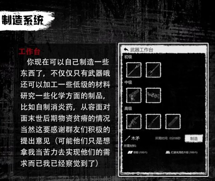 2、过了前期准备期(最初的1-2天左右),就进入了漫长的中期。现阶段,外出探索、基础物资流通成为重中之重。出门之前,一定要准备好一把方便的武器。毕竟,谁不想在世界末日中拿自己的生命做赌注,对吧? (收集到的材料可用于种植系统搭建,收集足够的药物,防止感染、受伤、生病)