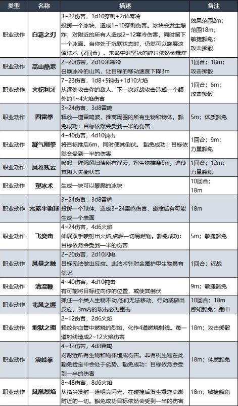 【专业动作-散打宗】共鸣气-爆炸:3~18点伤害,3d6力场。引爆生物体内的气,使其与你产生共鸣,对5m内的所有生物造成伤害。由此产生的爆炸还会引爆附近所有与你产生共鸣的生物。成功豁免:目标仍受到一半伤害(敏捷豁免)
