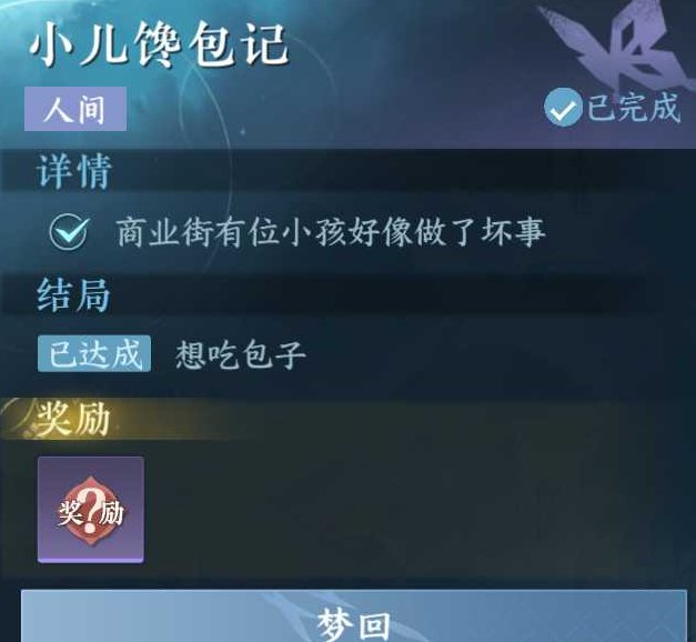 与汴京NPC对话934.1131,选择“我不是坏人”、“你饿吗?”、“我再给你买一颗”,任务奖励3个剧情点、2个风云灵、2个绑定玉。
